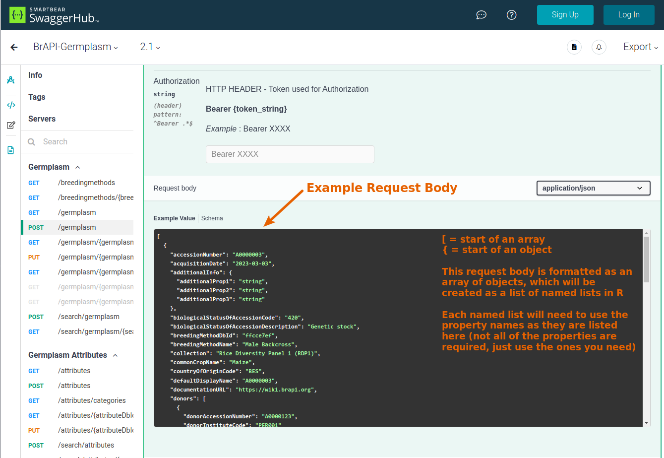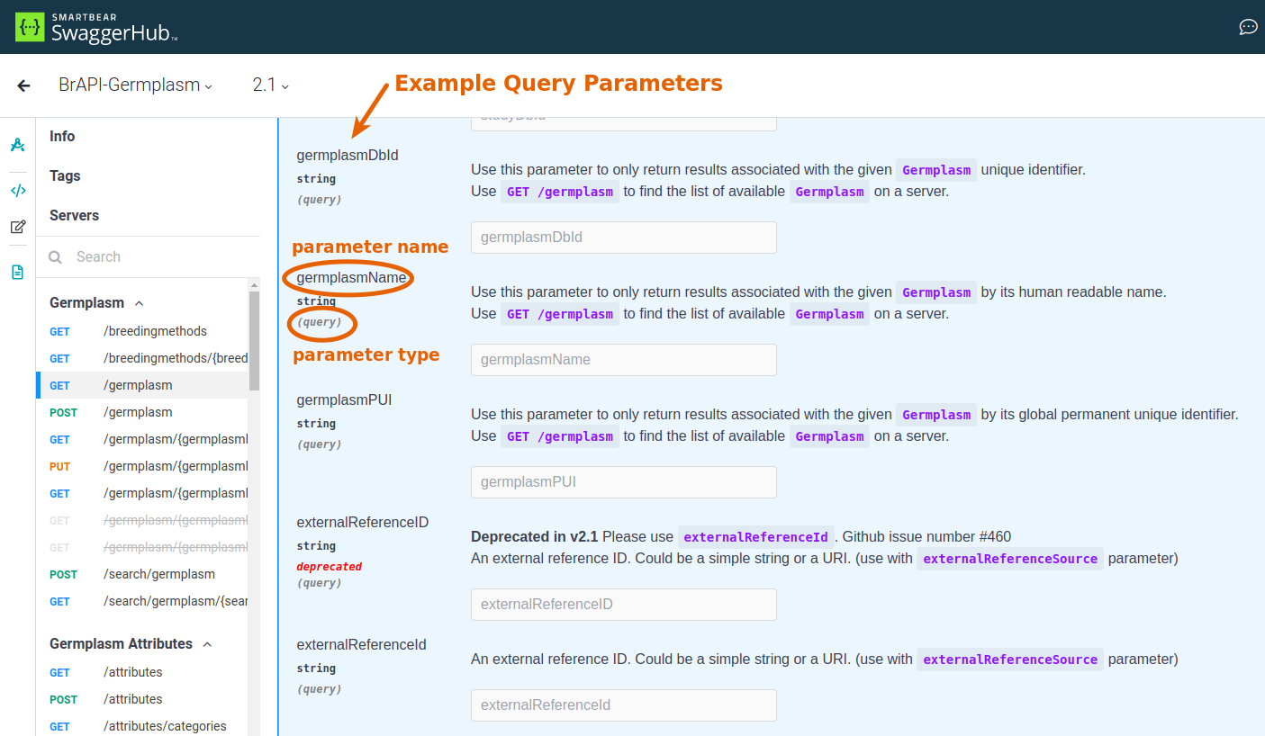 Sometimes, the URL of the endpoint is dynamic and includes a parameter that is different depending on which specific resource you are requesting. For example, when requesting the data on a specific single germplasm record, the URL of the endpoint will include the unique germplasm ID. In the BrAPI documentation the endpoint may be represented as:/germplasm/{germplasmDbId}. In this example, the second part of the endpoint is a variable that you'll replace with a value when making your request, such as:/germplasm/2589. -