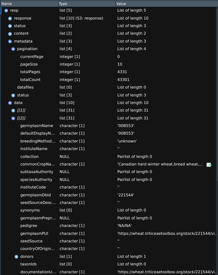and the r$data list contains information about the first 10 germplasm entries returned from the query.